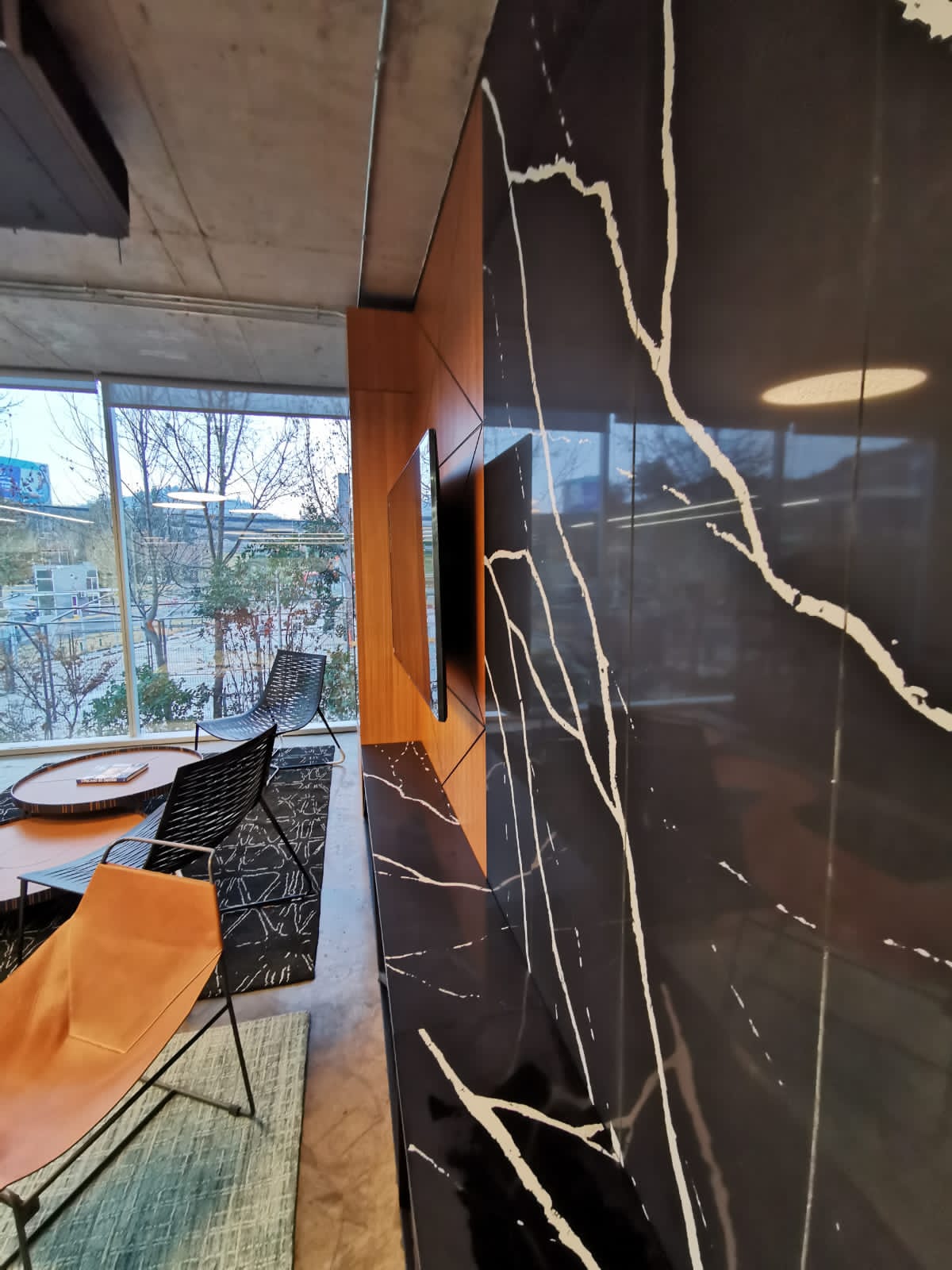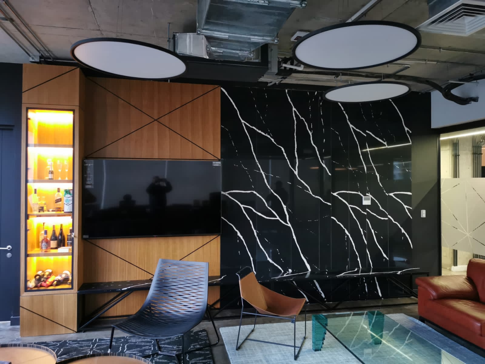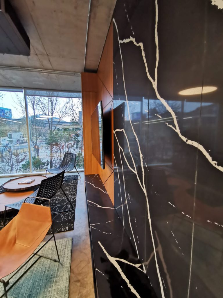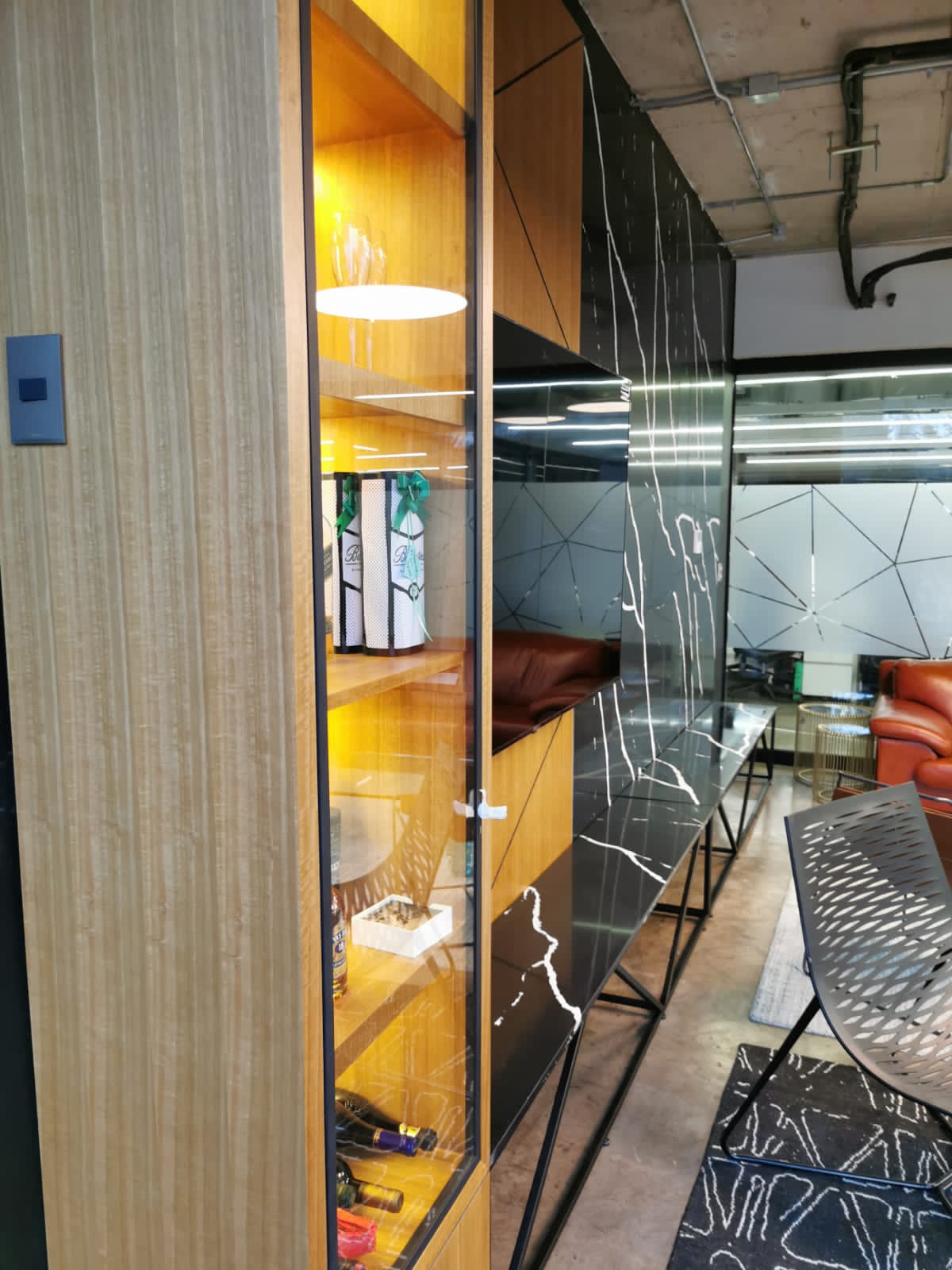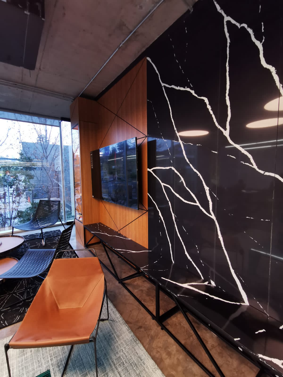 Aglomerado pino, cuarzo negro calacatta, banca negro electropintado, puerta vidriada.