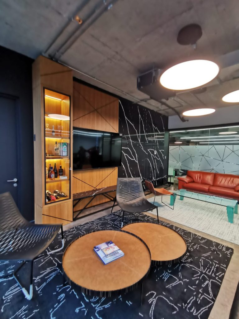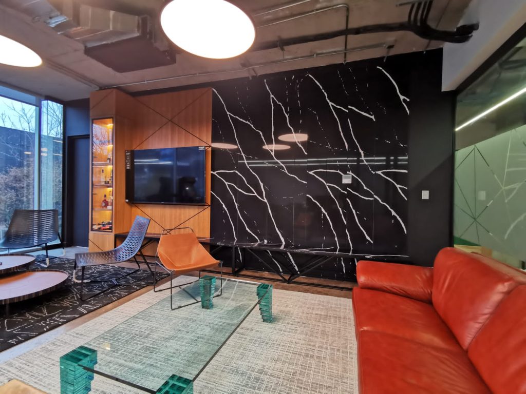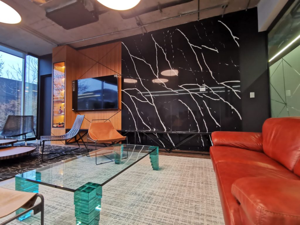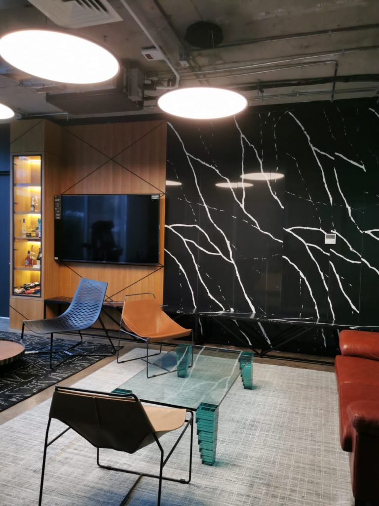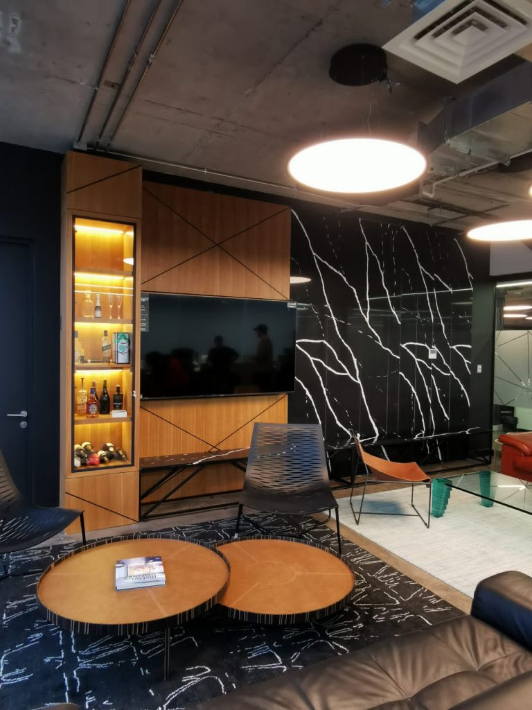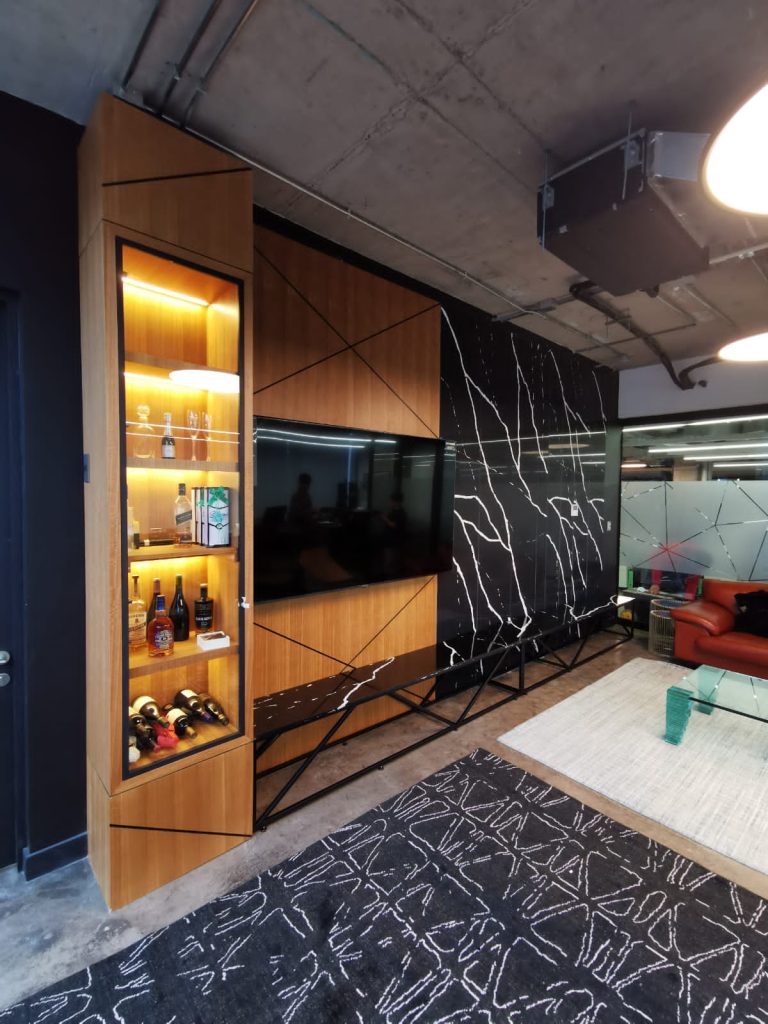 Aglomerado pino, cuarzo negro calacatta, banca negro electropintado, puerta vidriada.
